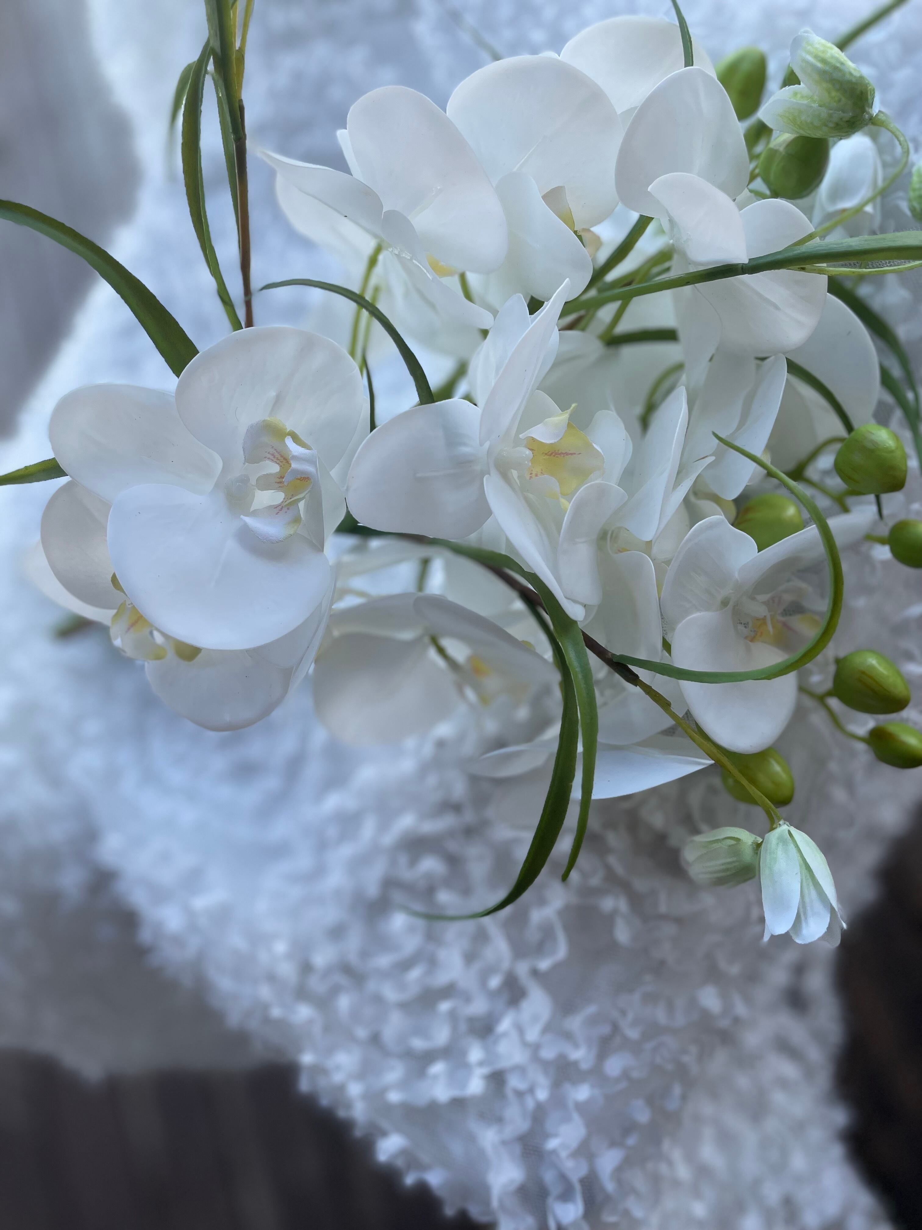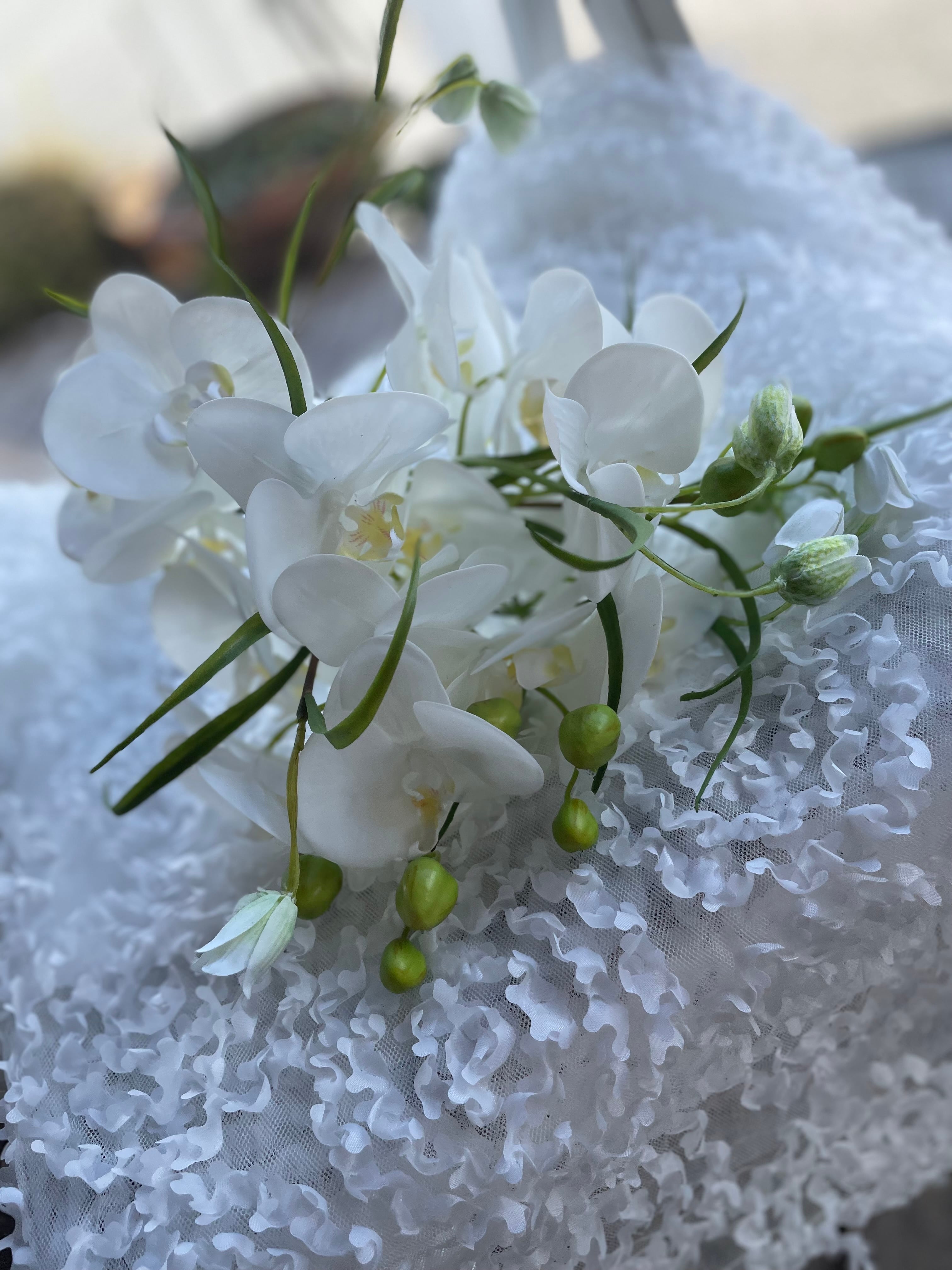 このブーケは、清楚な色合いで特に秋冬のシーズンにぴったりなアイテムとなっております。白無垢にもお持ち頂ける白い上品な仕上がりのブーケです。結婚式のテーマや雰囲気に合わせて、特別な日をいっそう華やかに演出します。また挙式後は、お部屋のインテリアとして末永く楽しんで頂けます。